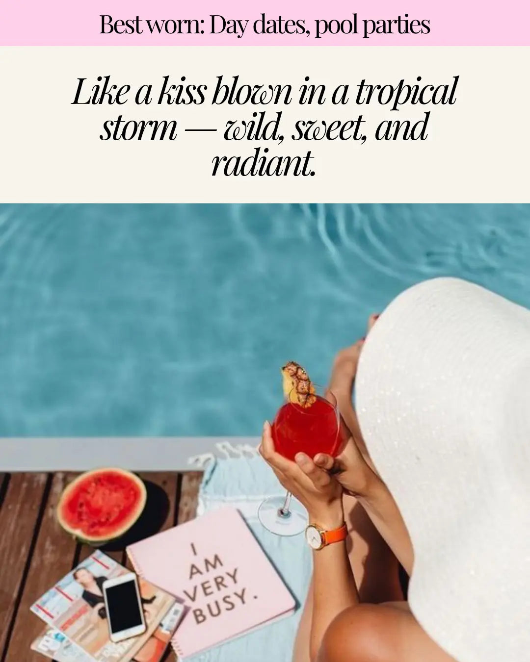 Like dancing barefoot in a warm tropical storm — bold, juicy, and joyfully unpredictable. It’s fun without being loud, flirty without trying. This scent lives in sunshine, fruit juice, and fireworks. You wear it when you're ready to be seen.
