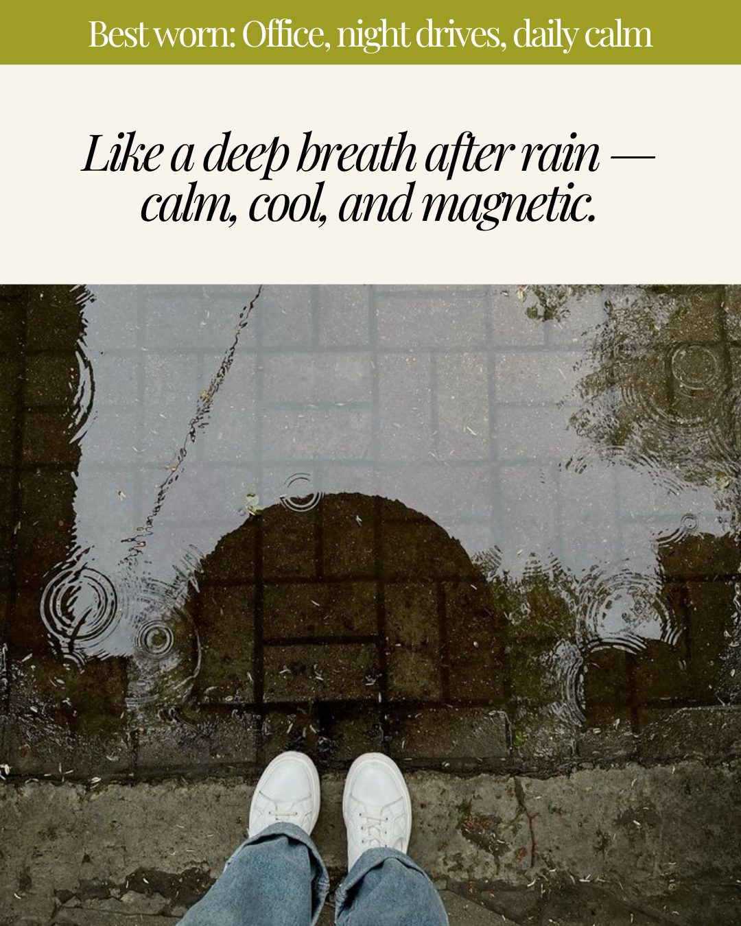You’re the first breath of cold air after rain, calm and commanding. Crisp citrus evolves into incense and woods, balanced and deep. This is not about being loud — it’s about being clear. It stays with you like a steady rhythm.